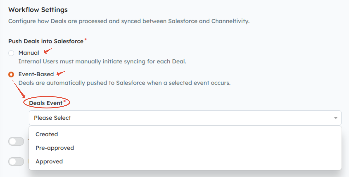 Event-Based (Automatic): Deals are automatically synced to Salesforce when a selected event occurs: