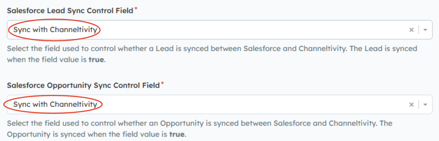 Select the "Sync with Channeltivity" fields you created in Salesforce on the Lead and Opportunity objects in Step 1 from the dropdown menus: