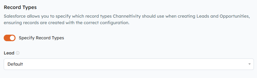 If you have different Lead record types defined in Salesforce, you can specify which record type Channeltivity should use when creating a new Lead.