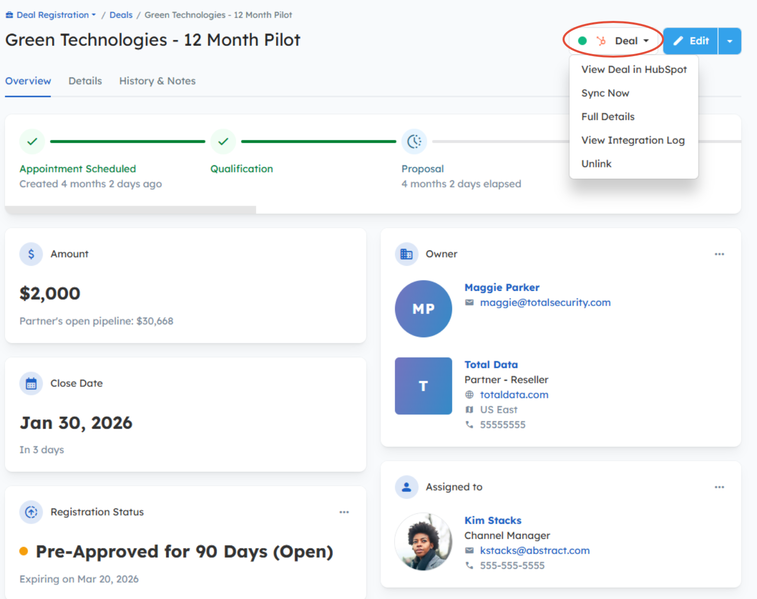 - Once a Partner submits a new Deal Registration, Channeltivity creates a linked copy of the registered Deal in HubSpot. This can be configured to happen automatically or on a manual basis.