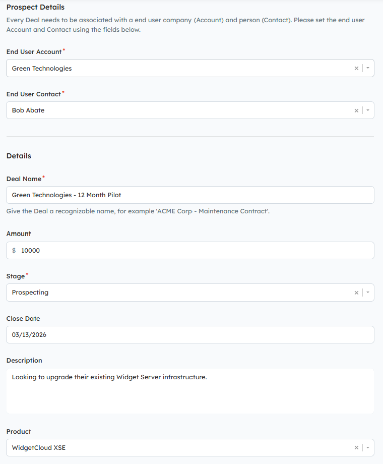- Prospect Details: End-user customer account and contact information