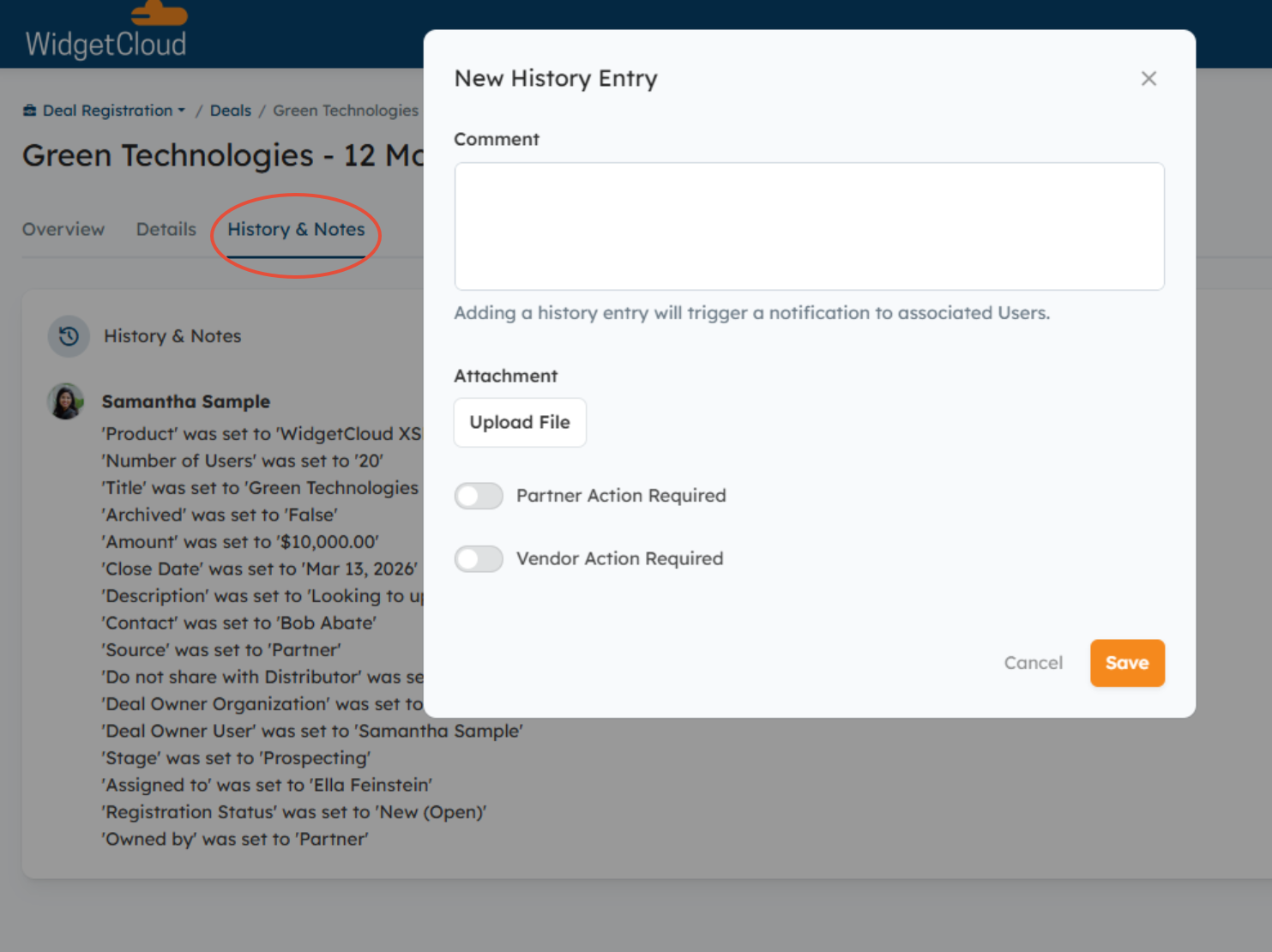 The Deal's History & Notes section features a log with timestamps of all changes made to the Deal. It also enables Partners and Internal Users to collaborate on Deals by adding comments and uploading files.