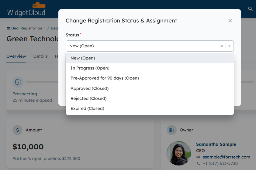 The approval process for Deals is managed by your internal team via the Deal Registration Status field, which can be customized to include Statuses relevant to your program.