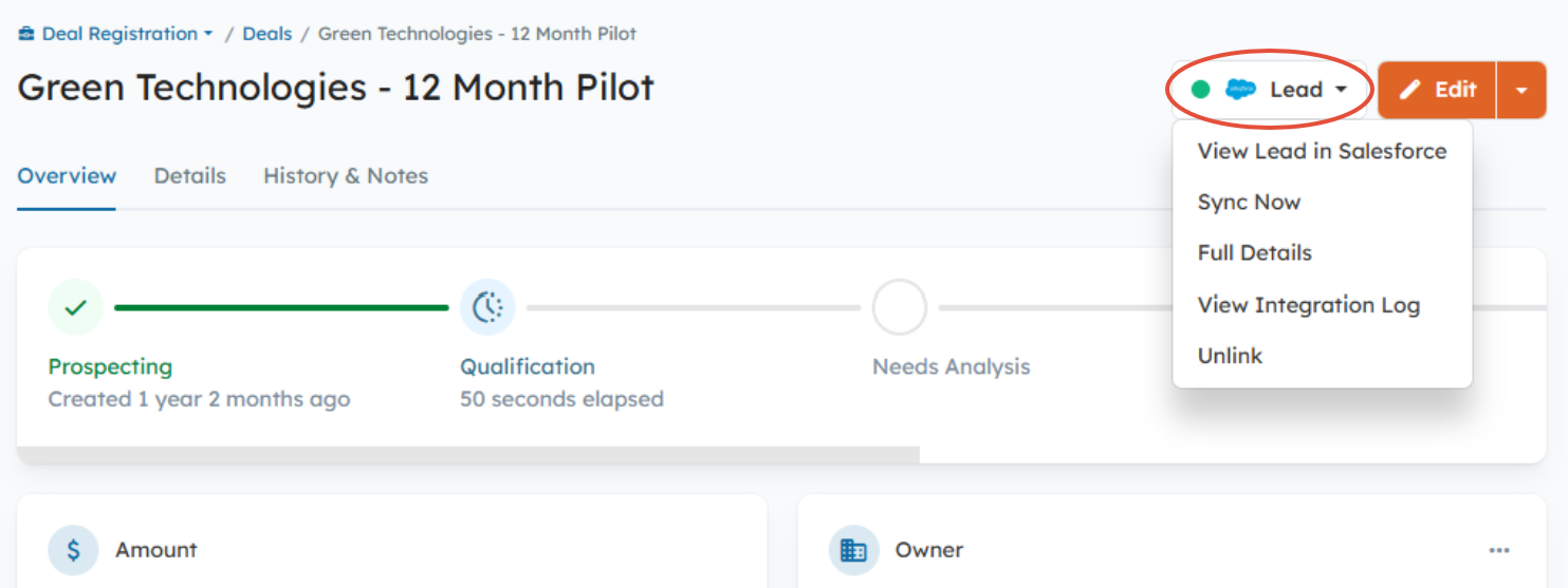 Partners can view and edit Deals as needed, as well as track key details from the Deal's Overview page, which includes a visual progress bar showing the Deal’s current Stage at a glance, and the Registration Status indicating the Deal's approval status.