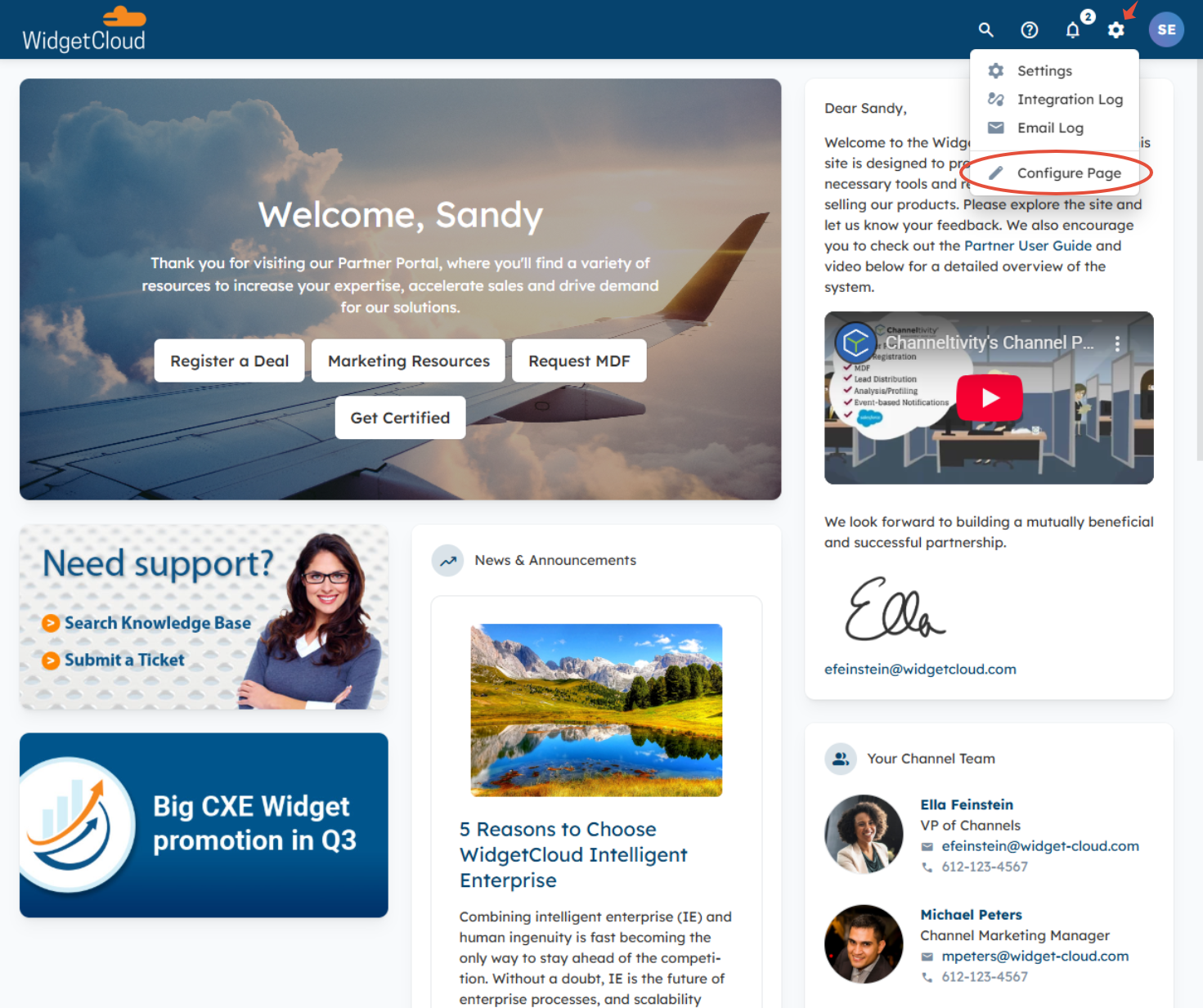 To begin configuring a custom page, click the gear icon in the top right corner of the portal's header > Configure Page.