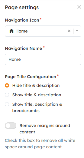 The Page Configuration menu will open in the right side panel, which includes the following configuration options: