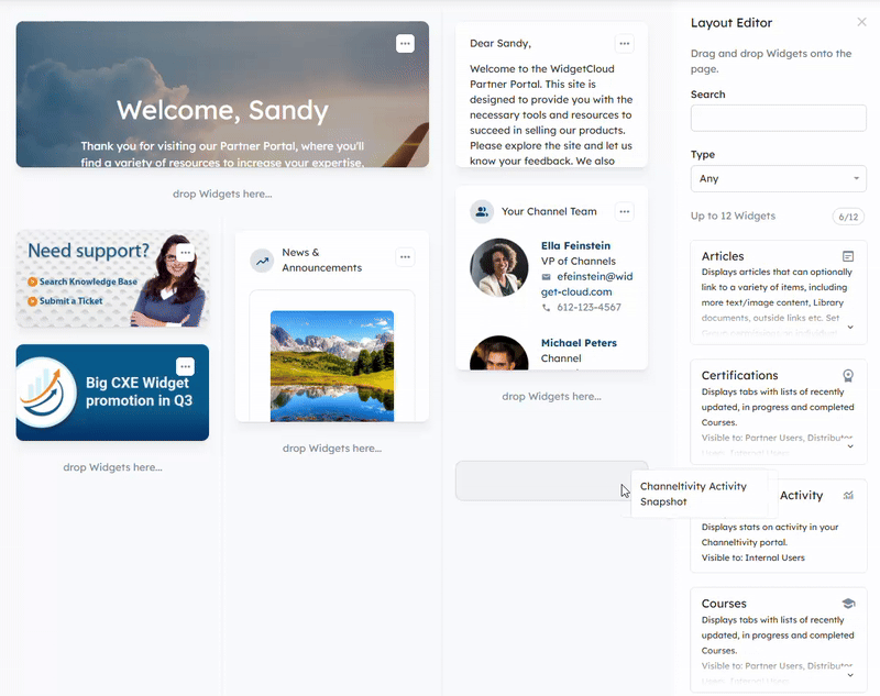 The Layout Editor Widget will appear on the right side panel, which will include a list of Widgets that can be added to the page. You can review a brief description of each Widget to help determine the appropriate Widget to display your content. Once you've decided on a Widget, click and drag it over to the desired location on your custom page.