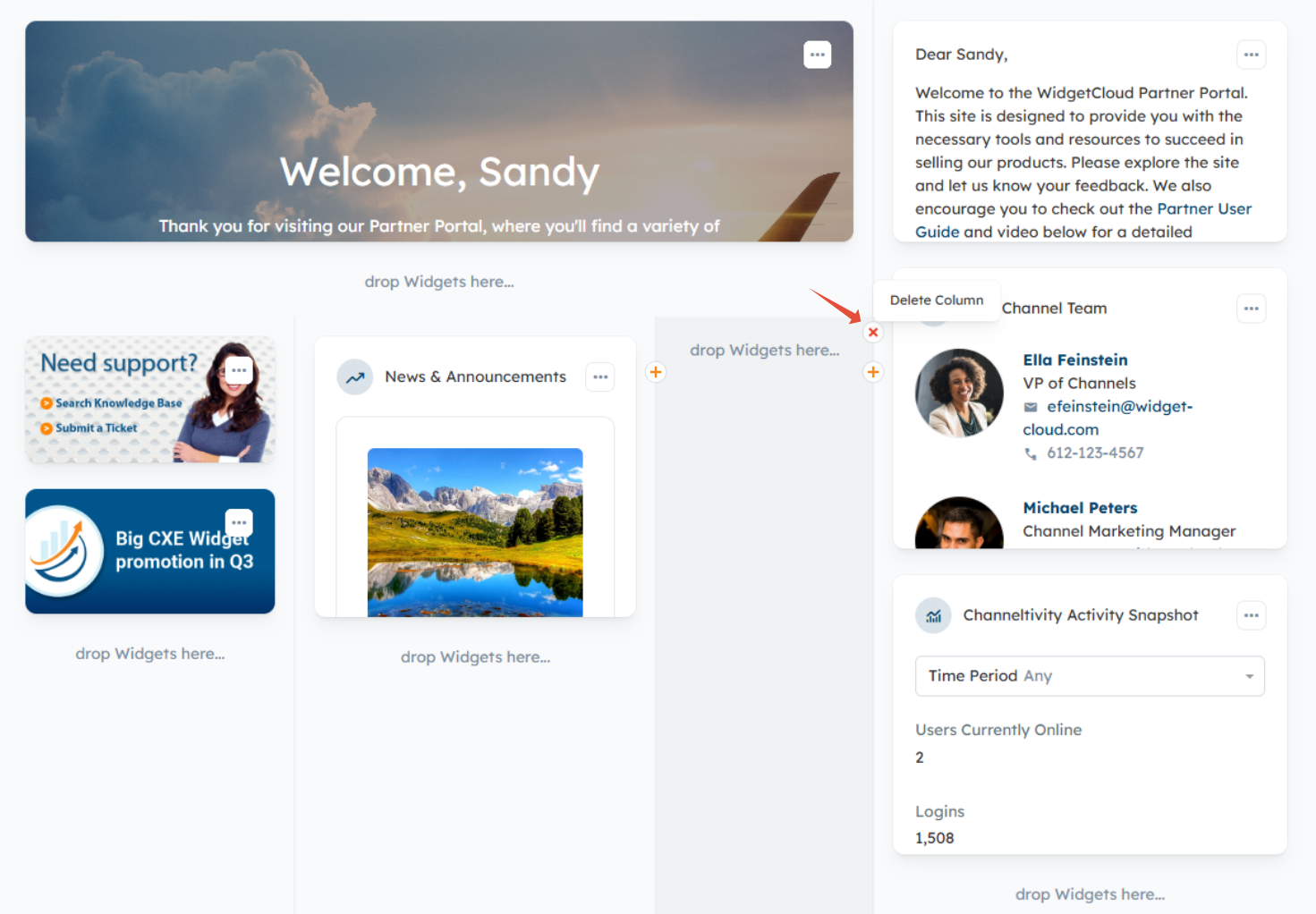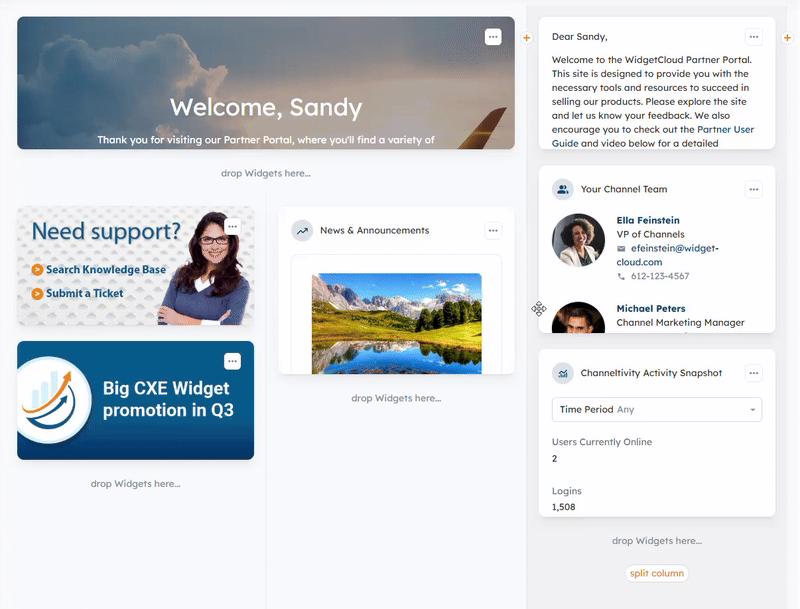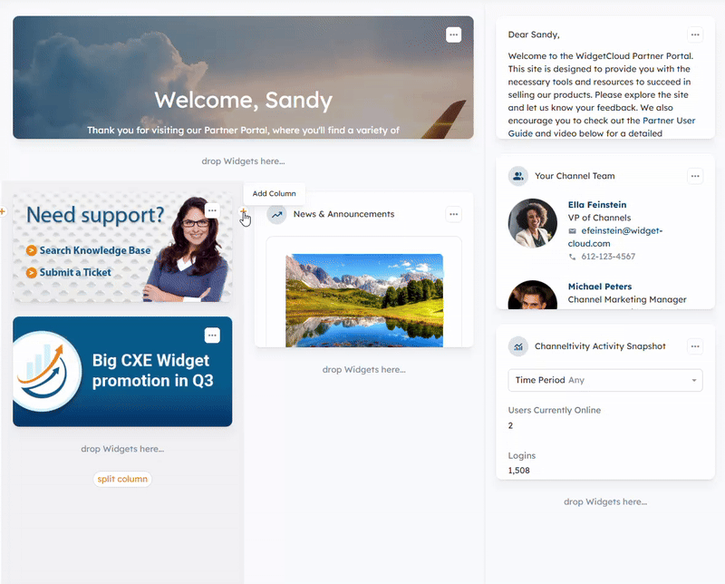 Columns can also be split to display Widgets side-by-side by clicking the "Split Columns" button under the "drop Widgets here" areas in a column.