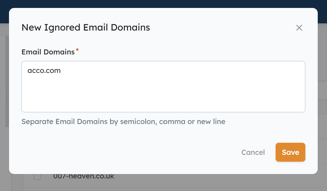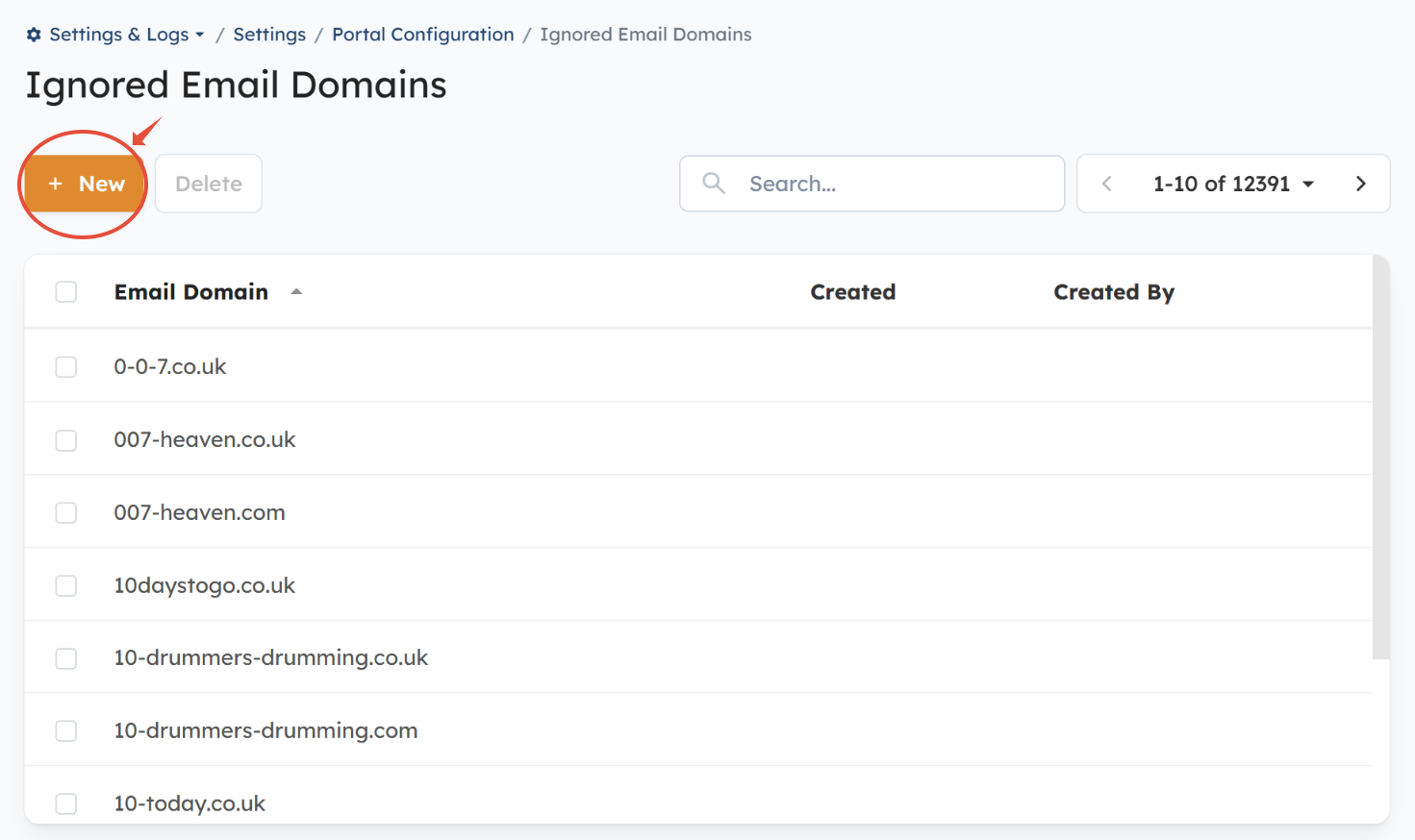 To add an email domain to the Ignored Email Domains list, you must first make sure the email domain is not associated with any Organization. If it's associated with an Organization, you'll need to remove it, then go to Settings > Portal Configuration > Ignored Email Domains > click the "New" button > enter the email domain > Save.