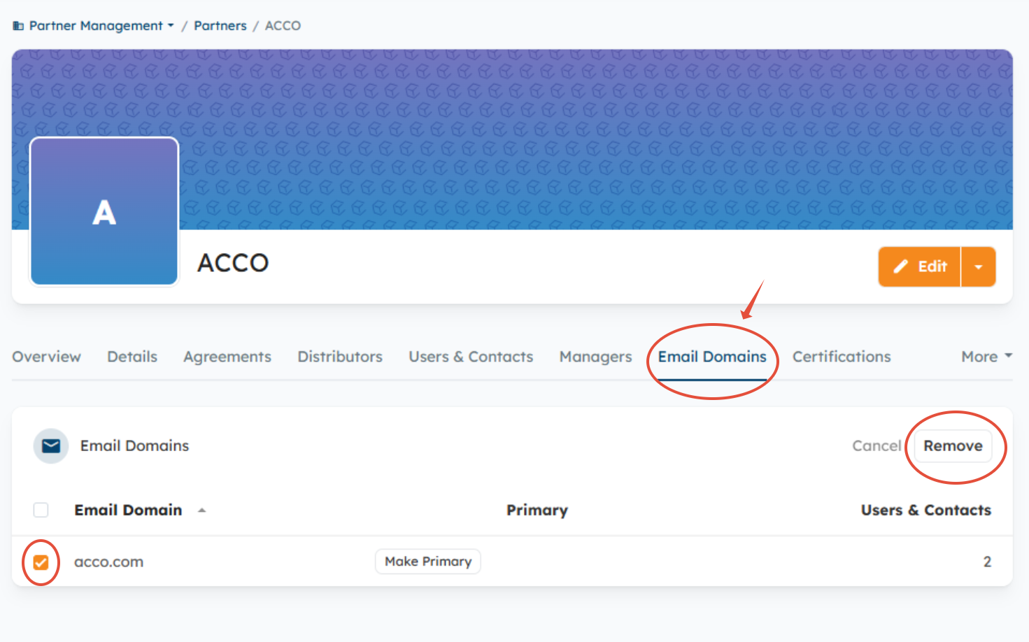 To remove an email domain from an Organization, go to the Organization record in Channeltivity (Admin > Organizations) and click the "Email Domains" tab to view all of the domains associated with the Organization. You'll then select the checkbox next to the email domain that you want to remove and click the Remove button.