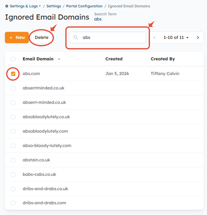 You can remove a domain from the ignored email domains list by going to Settings > Portal Configuration > Ignored Email Domains, searching for the domains you're looking to remove, selecting the checkbox next to the domain, and clicking the "Delete" button.