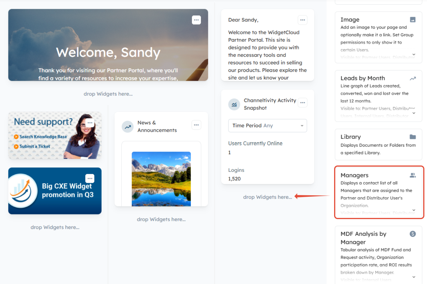 You'll then select the Managers Widget from the right side panel to drag the Widget to the desired location on the home page.