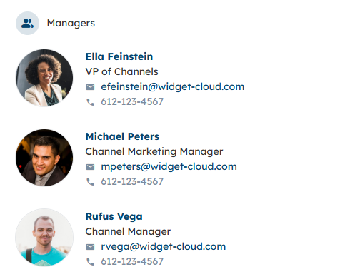 The Managers Widget displays a contact list of all the Partner Managers assigned to Partner and Distributor Organizations. Learn how to assign Internal Users to Organizations as Managers using the instructions in this article: What is a Partner/Distributor Manager?.