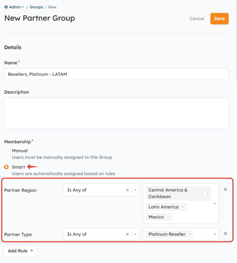 - Smart: automate the assignment of Users based on rules that you define. In the example screenshot below, any Users that are members of Partners of the "Gold Reseller" type will be automatically assigned to this Group. In general, we recommend using Smart Groups to minimize administrative overhead.