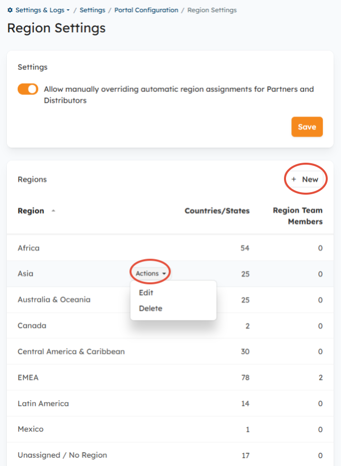 - Assign Internal Users to Regions as Managers (applies to Deal Registration only): Hover over the Region you wish to assign a Manager to and click the "Actions" button > Edit.