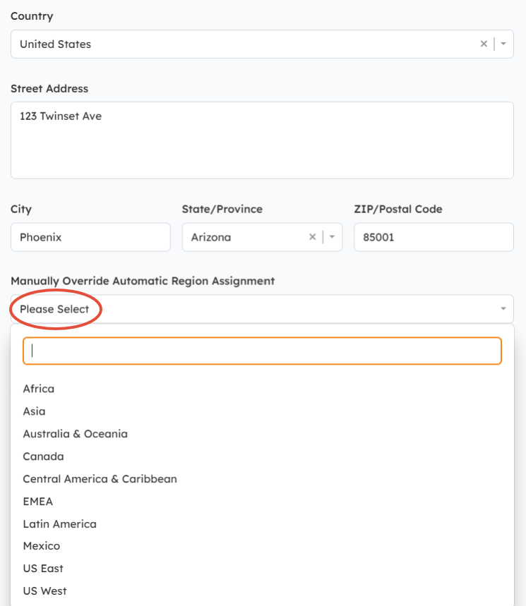 Once enabled, you can manually assign Organizations to Regions using the "Manually Override Automatic Region Assignment" field that is added to Organization records upon enabling this functionality.