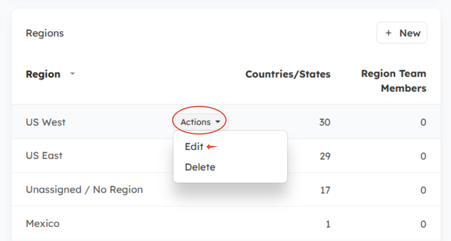 - Update the name or countries/states assigned to an existing Region: Hover over the Region you wish to update and click the "Actions" button > Edit. You'll then follow the steps in this article to make your updates.