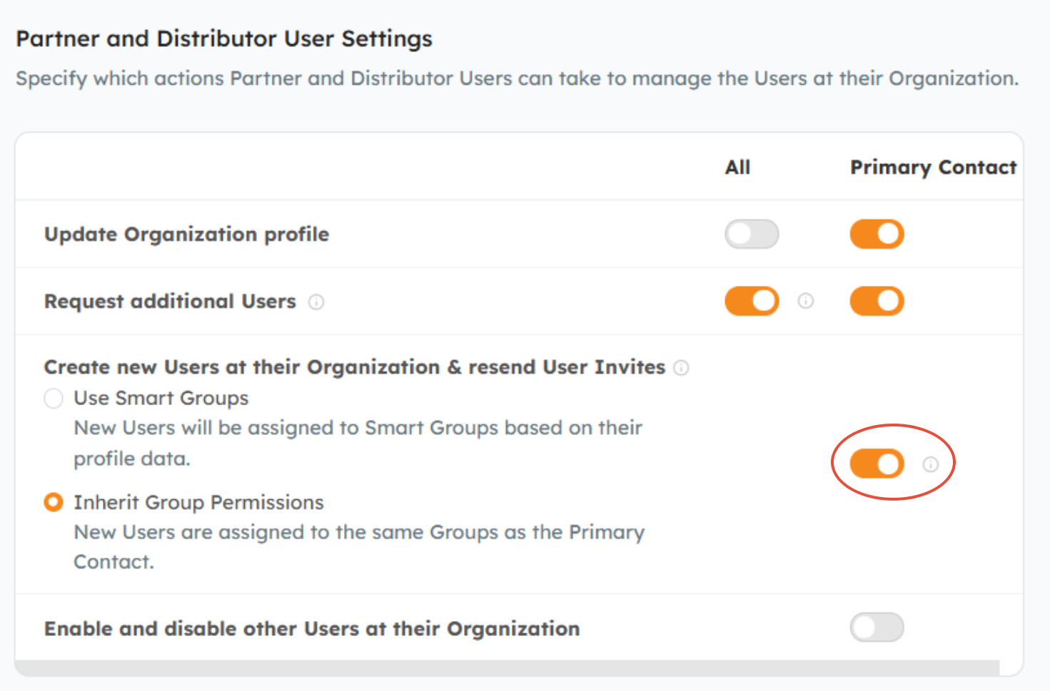 Note: You can enable the below setting by going to Settings > Portal Configuration > General Portal Settings to give Primary Contacts at Partner and Distributor Organizations the ability to add new Users and manage existing Users using the instructions listed in this article.