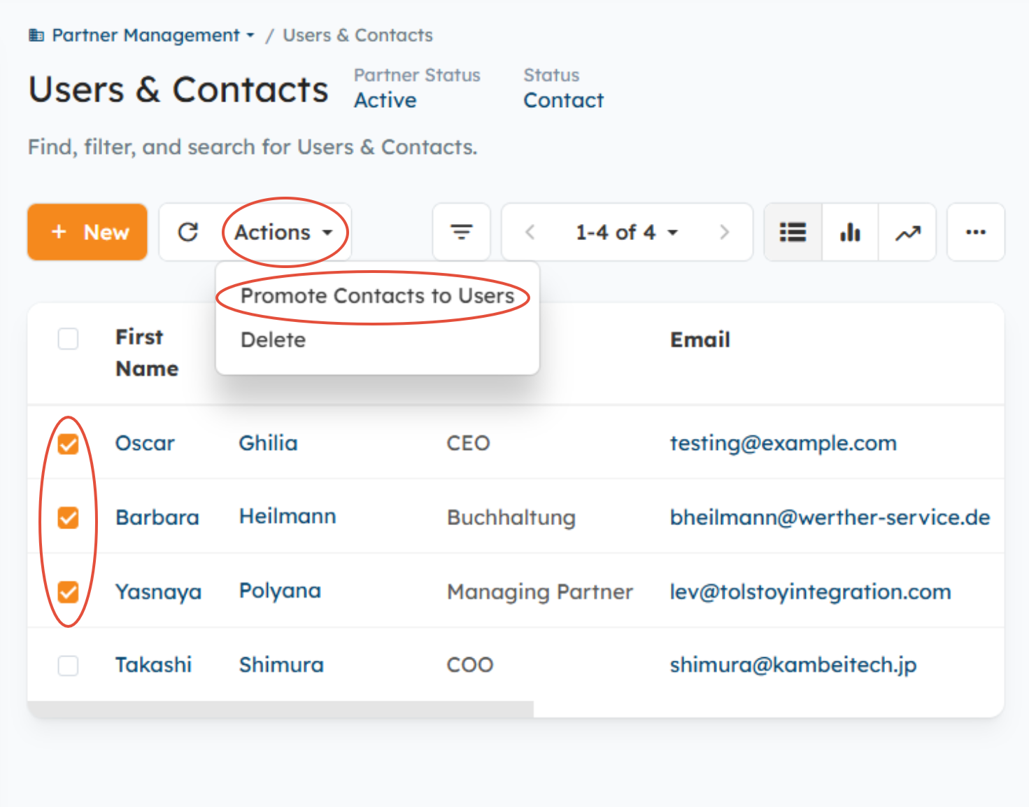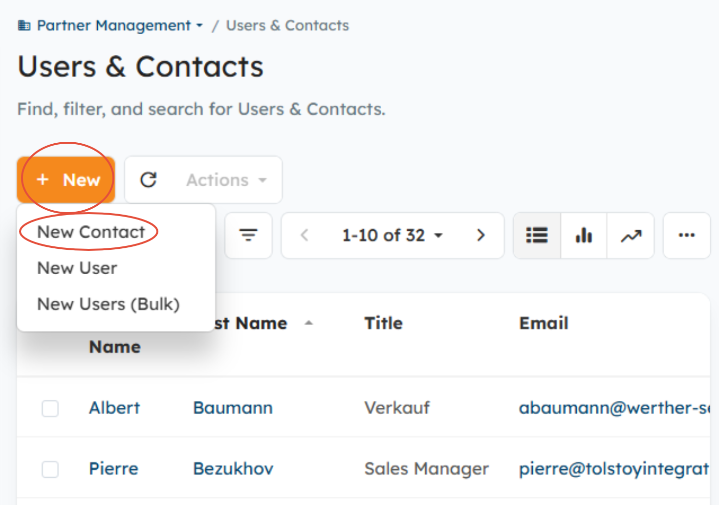 - Go to Partner or Distributor Management> Users & Contacts