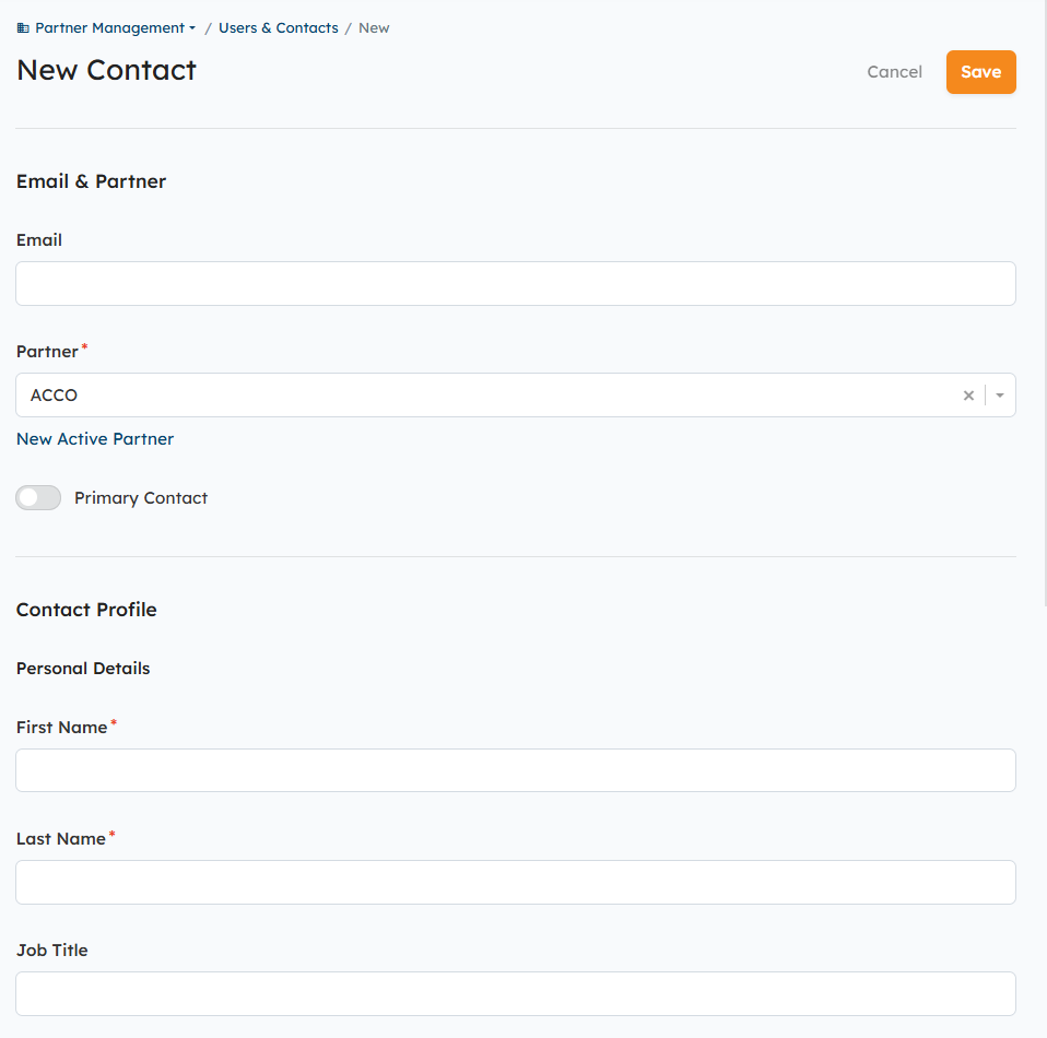 - In the left navigation menu, hover over Partner or Distributor Management and select Users & Contacts from the subnavigation menu > New > New Contact.