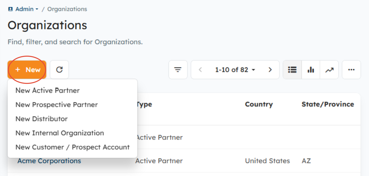 You can also add/view Partner and Distributor Organizations by going to the Partner Management module to add Partners, and the Distributor Management module to add Distributors.