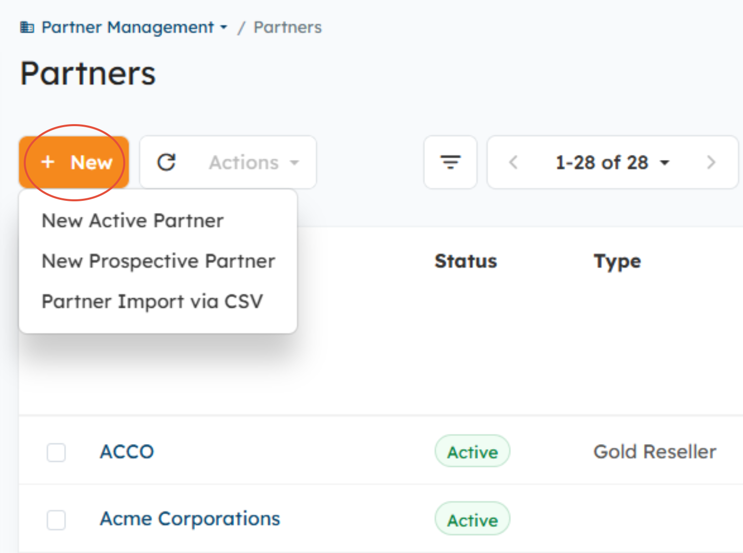 - Select the New button > Partner Import via CSV