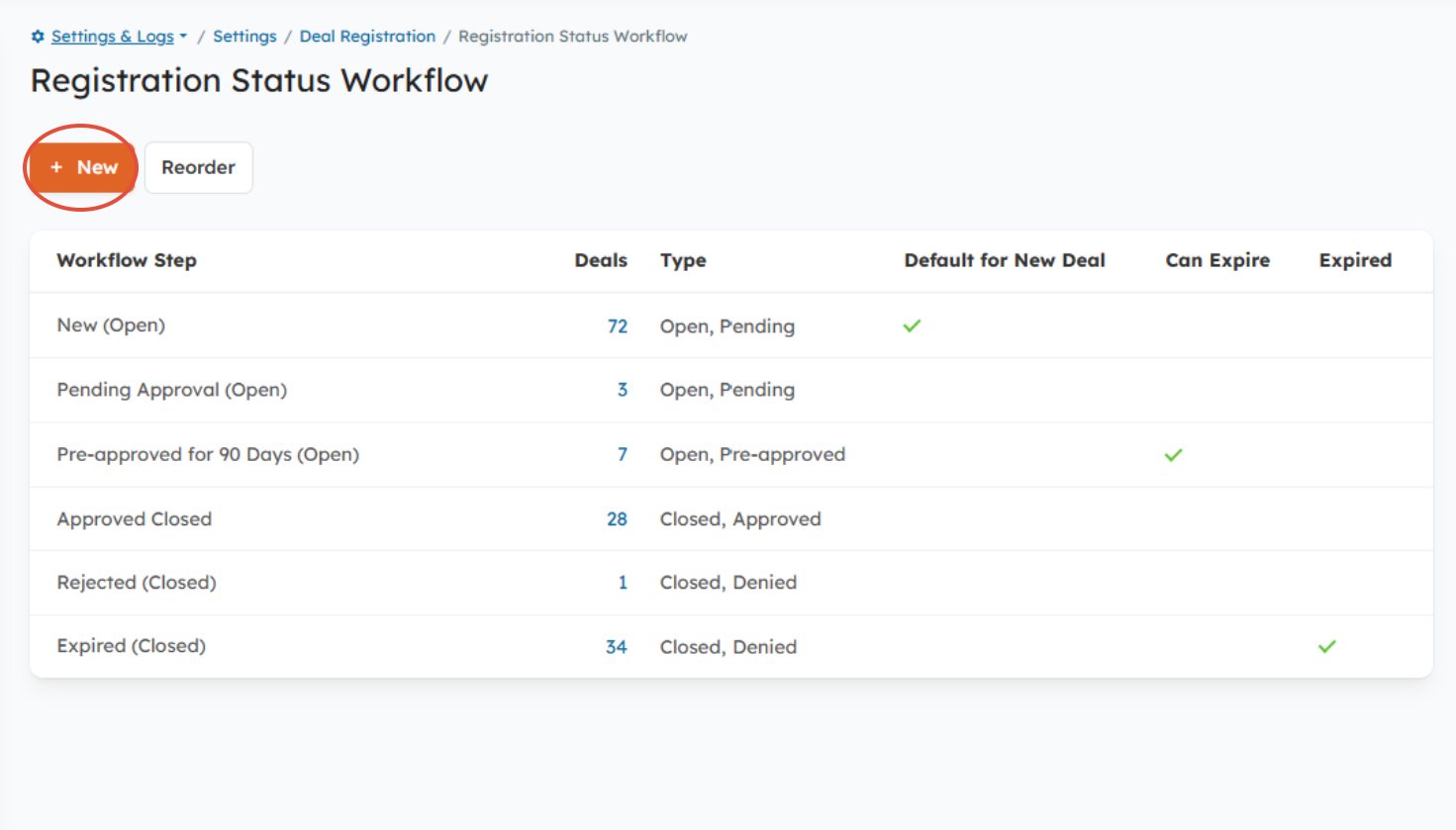 The Registration Status workflow settings control the approval process for Deal Registrations. To configure this setting, go to Settings > Deal Registration > Registration Status Workflow.