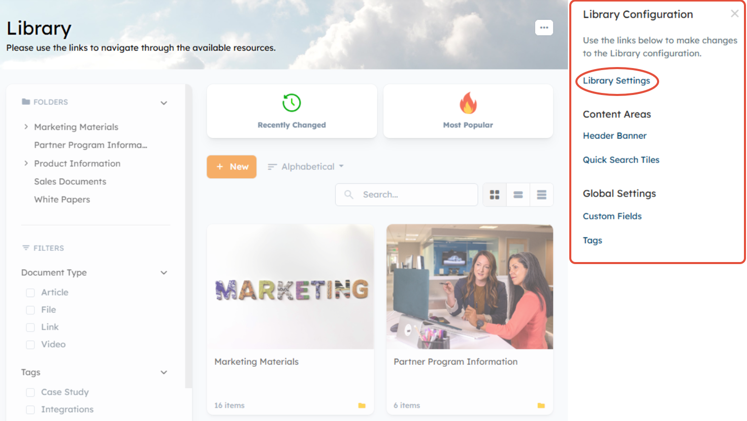 Note: You can also access the Library's global default settings from the Navigation & Custom Pages settings area by going to Settings > Portal Customization > Navigation & Custom Pages. You'll then click the "Edit" button next to the Library to configure the below global default settings for the Library.