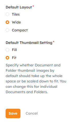 Default Thumbnail Display Setting: Choose your default preferences for thumbnail images associated with Documents and Folders. You can choose to have the thumbnail images occupy the entire space or scale them down to fit.