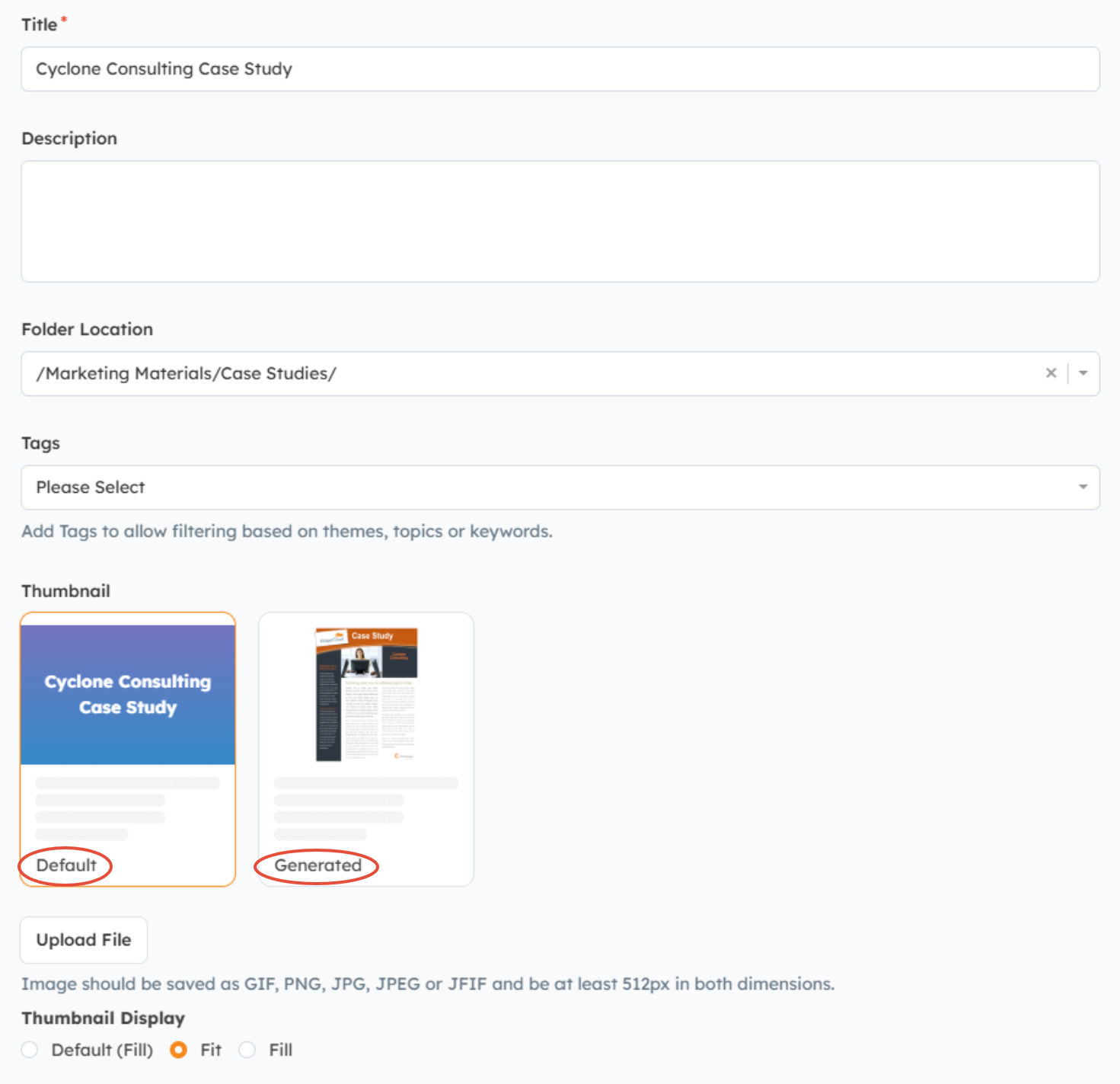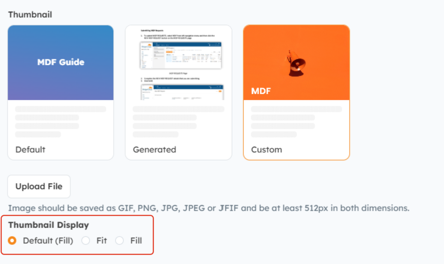 When you add a Document to the Library, the Default thumbnail, which is an image that includes the file's title is automatically selected. However, for certain file types such as images and PDFs, an additional thumbnail image is automatically generated. You can choose to use one of the system-generated Thumbnail images or upload your own custom image for the Thumbnail.