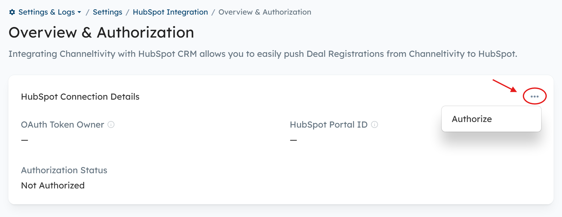 Channeltivity's Integration with HubSpot requires a HubSpot Admin to authorize Channeltivity access to HubSpot by going to Settings (in Channeltivity) > HubSpot Integration > Overview & Authorization > click the ellipsis icon (three dots) in the top right > Authorize