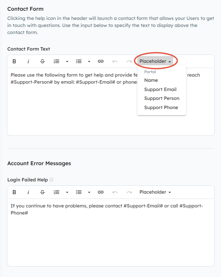 Tip - Use the Placeholder functionality to pull in items from the Portal Details section listed above, such as the Support Contact, Phone Number, and Portal Name. You can also use the Support Email Placeholder to pull in the email address listed for your Portal Support Email.