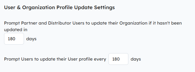 By default, the system will prompt Partners and Distributors upon login to update their Organization and User profile data every 180 days (if it hasn't been updated). You can change the number of days between updates in the User & Organization Profile Settings.