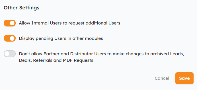 - Display Pending Users in other modules - enabling this setting allows you to assign Leads, Deals, Referrals, and MDF Requests to pending Users.