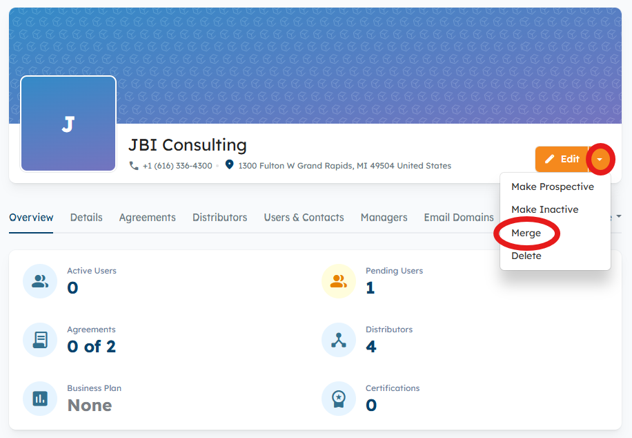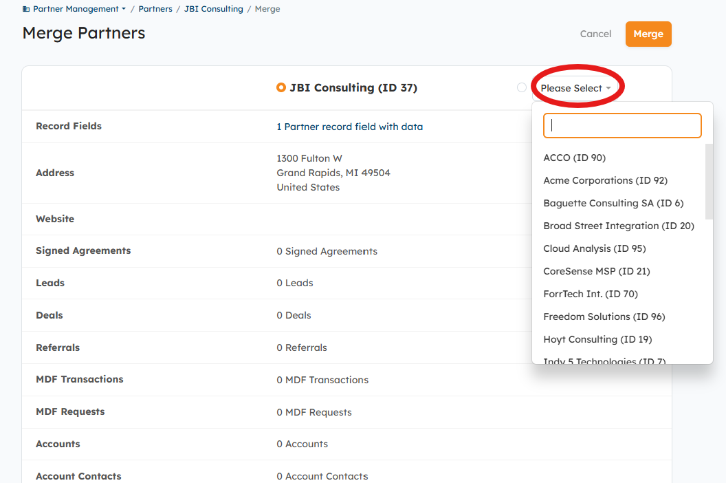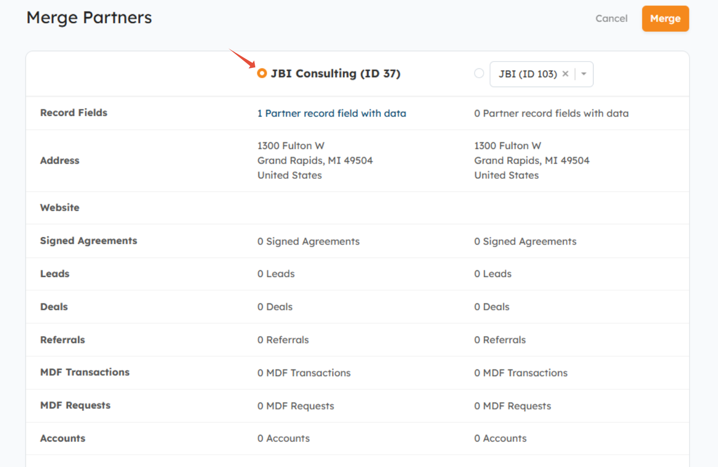Click the radio button (circle) next to the Partner you want to keep as the Master, then click Merge. This record will be retained, and any associated data from the other record will be merged into it.