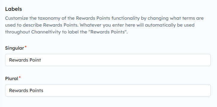 Customize the taxonomy of the Rewards Points functionality by changing what terms are used to describe Rewards Points. Whatever you enter here will automatically be used throughout Channeltivity to label the "Rewards Points".