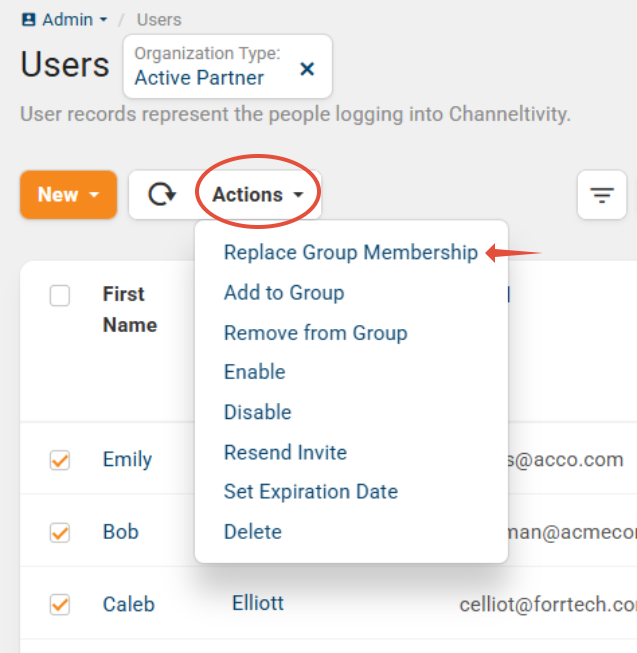 - Select the checkbox next to the User(s) you want to update. (Note: Users must belong to the same Group Type. For example, Partner Users can only be assigned to Partner Groups.)