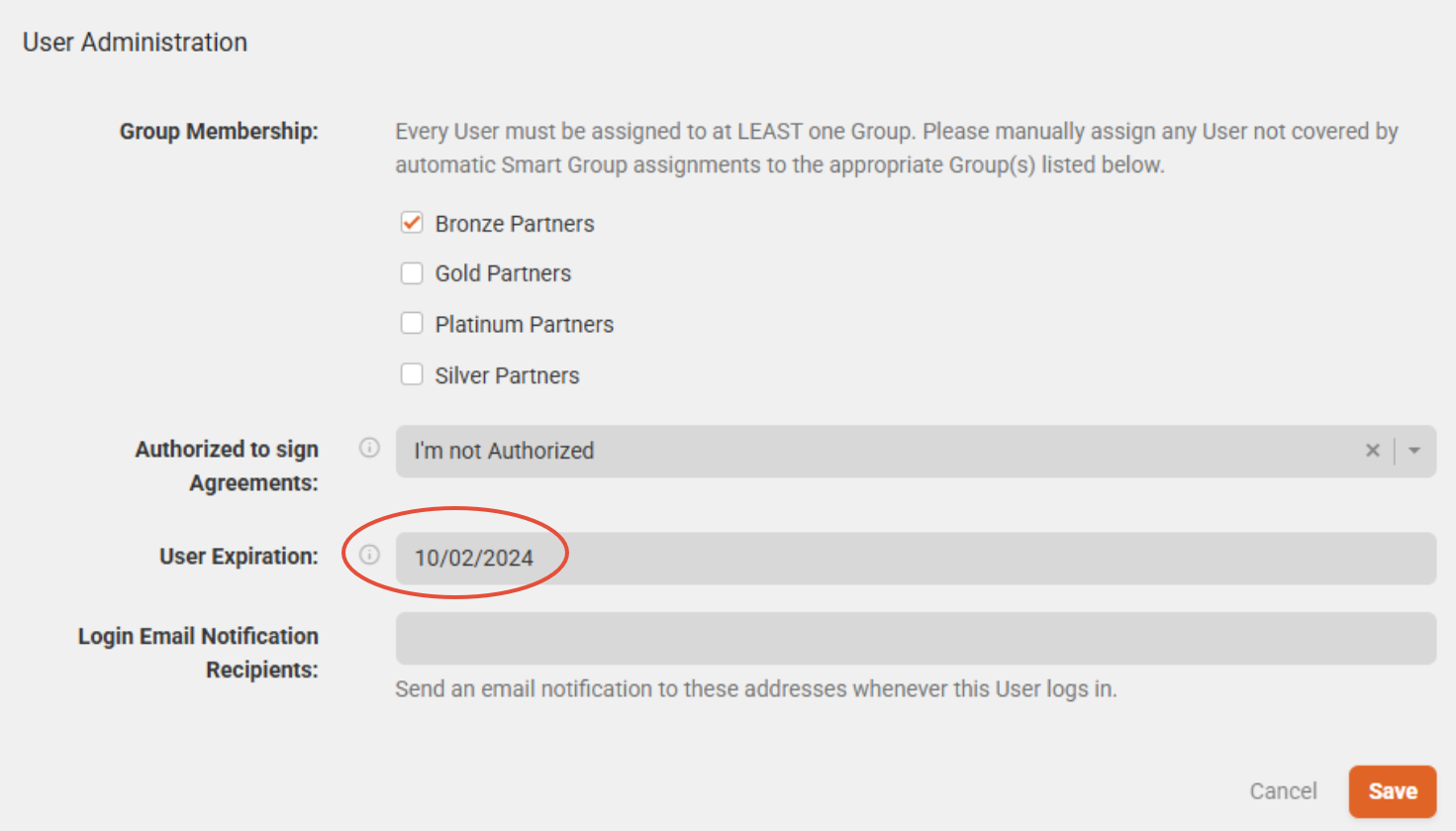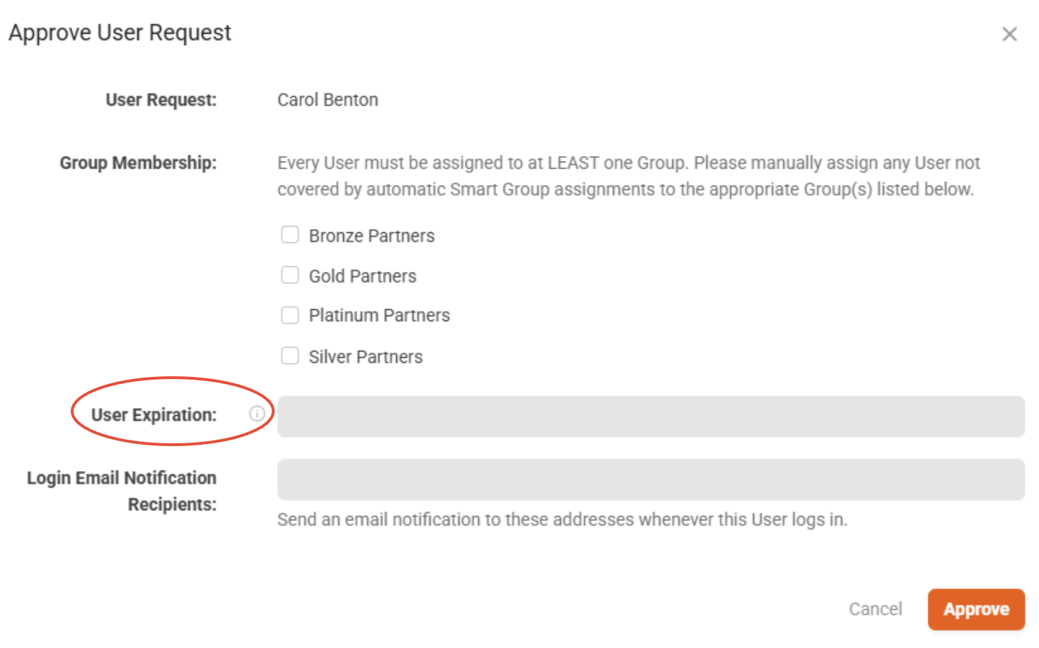 - When creating a new User or approving a User Request, enter a date in the Expiration Date field.