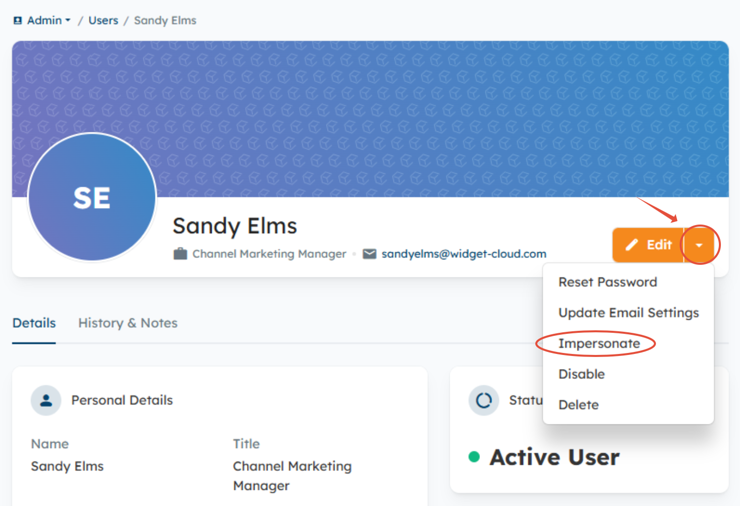 The steps to impersonate a User have changed slightly. To impersonate a User, navigate to the User’s profile and click the caret icon (▼) next to the Edit button in the top-right corner, then select Impersonate.