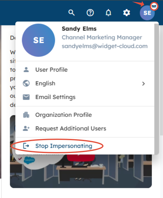 You will then be taken to the User’s view of the home page, where you'll see the Impersonation badge icon attached to the User's profile icon in the top right, confirming that you are impersonating the User. To stop impersonating, you'll click on the User's profile icon > Stop Impersonating.