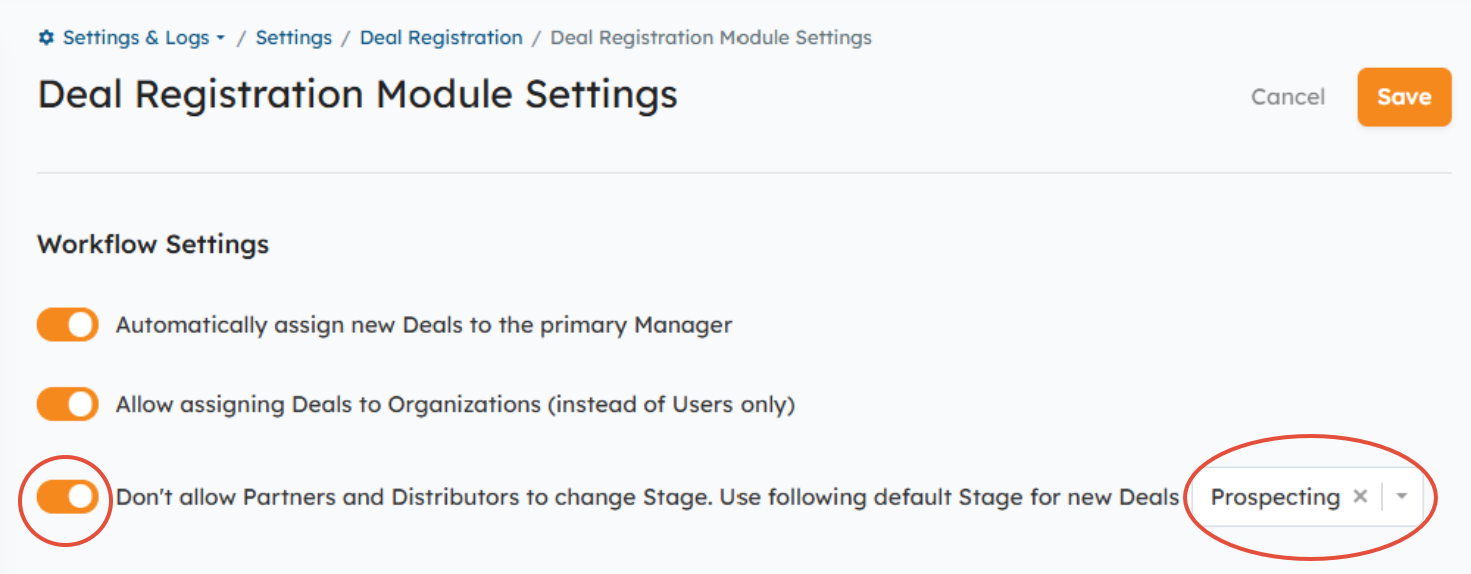 You can prevent Partners and Distributors from editing the Deal Stage field and define a default Stage for newly registered Deals by going to Settings > Deal Registration > Deal Registration Module Settings. You'll then enable the "Don’t allow Partners and Distributors to change Stage" setting and select a default Stage value (excluding Closed Won/Lost Stages) for new Deals from the dropdown menu.