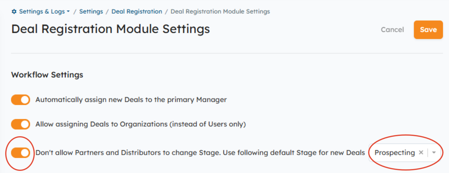 You can prevent Partners and Distributors from editing the Deal Stage field and define a default Stage for newly registered Deals by going to Settings > Deal Registration > Deal Registration Module Settings. You'll then enable the "Don’t allow Partners and Distributors to change Stage" setting and select a default Stage value (excluding Closed Won/Lost Stages) for new Deals from the dropdown menu.