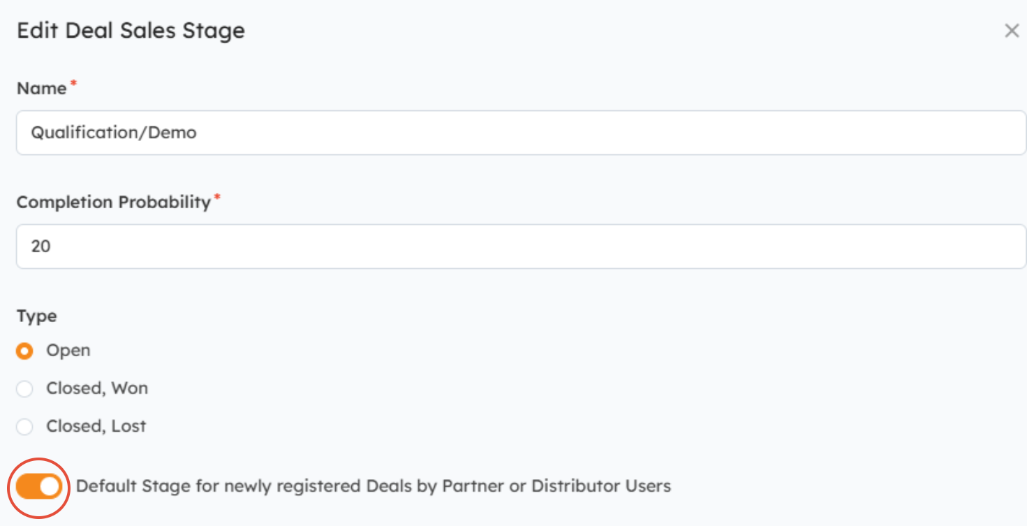 Once enabled, the Stage field will be read-only for Partners and Distributors, and any Deals they register will automatically be set to the default Stage you selected.