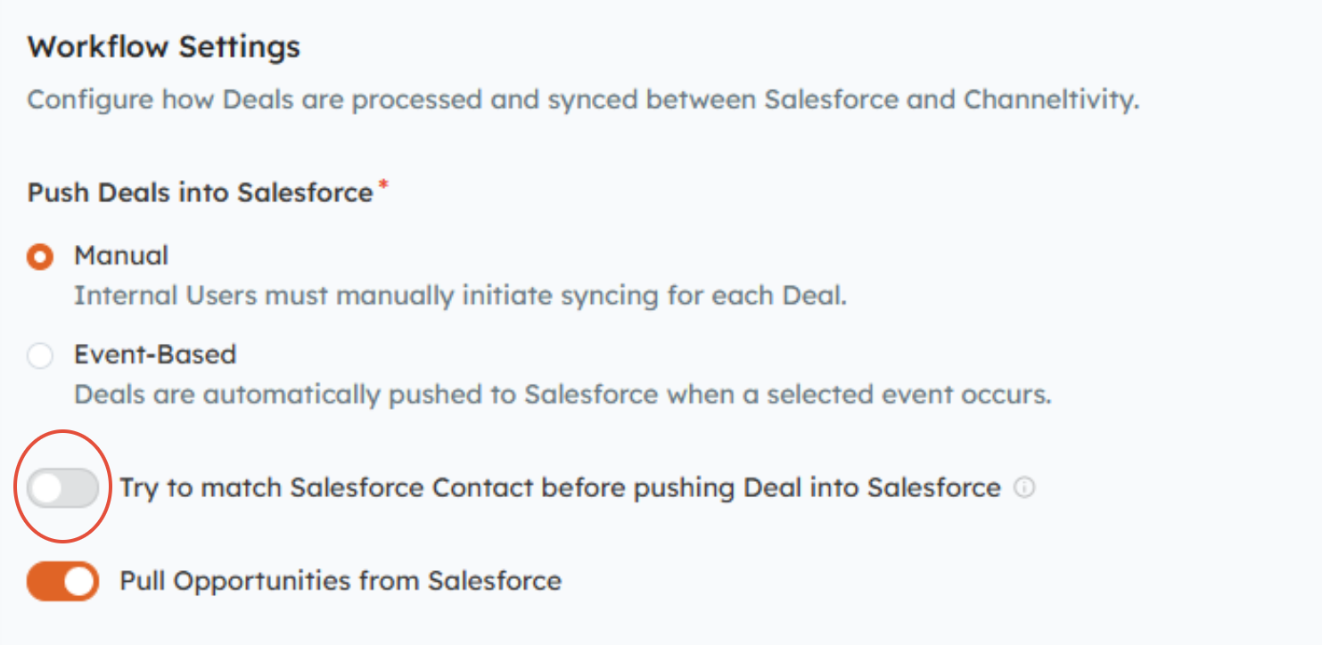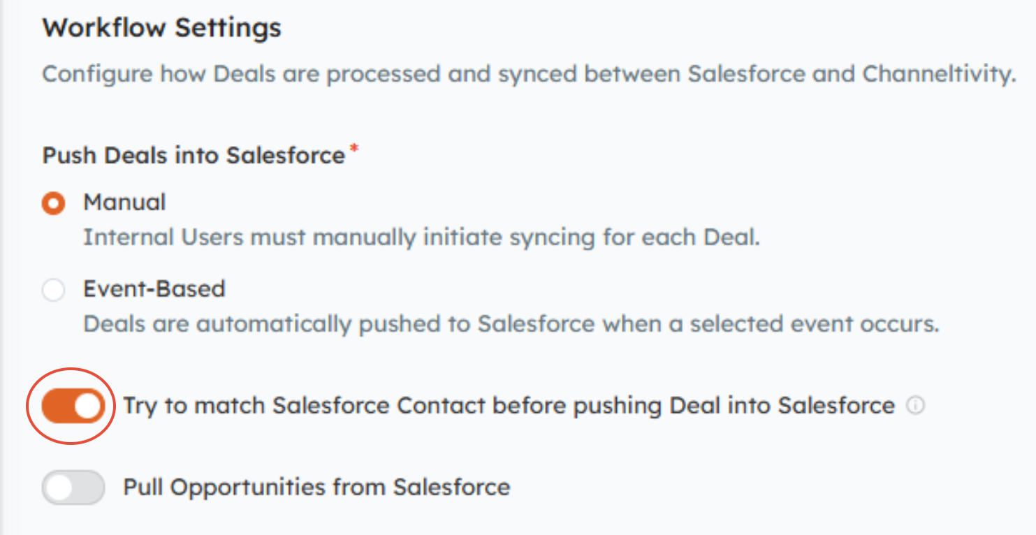 In Channeltivity, go to Settings > Salesforce Integration > Deal Registration, and toggle the “Try to match Salesforce Contact before pushing Deal into Salesforce” setting to the ON position.