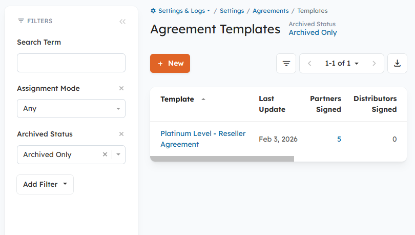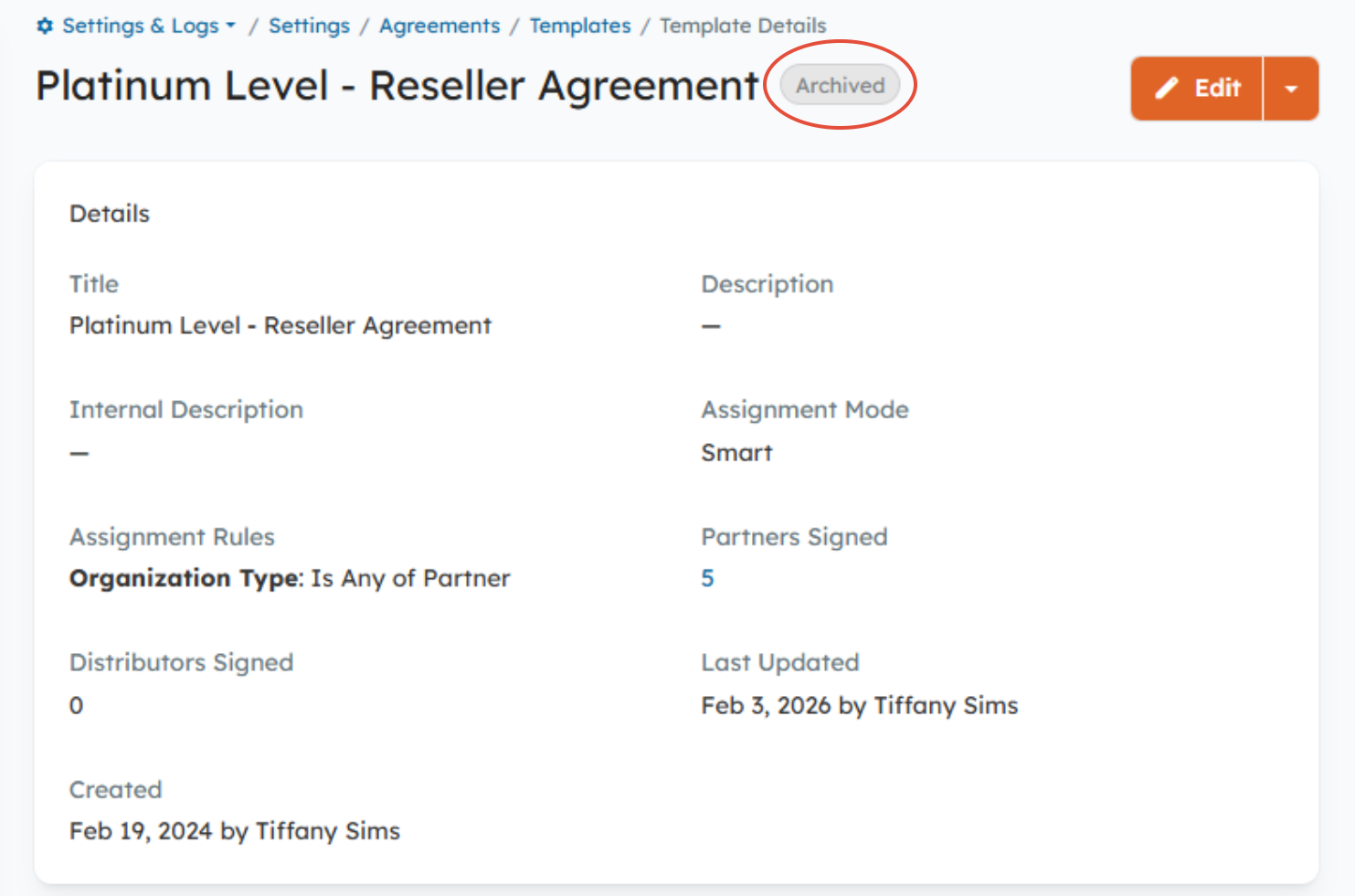 Archiving an Agreement Template allows you to retire an Agreement Template without deleting it. This is useful when a Template is no longer active, has been replaced by a newer version, or should no longer be assigned to Organizations, but still needs to be retained for recordkeeping, reporting, or historical reference.