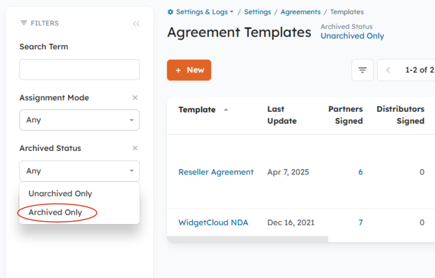 Once archived, the Agreement Template will be unassigned immediately from any Organizations to which it was previously assigned (applies only to Pending/Unsigned Agreements).